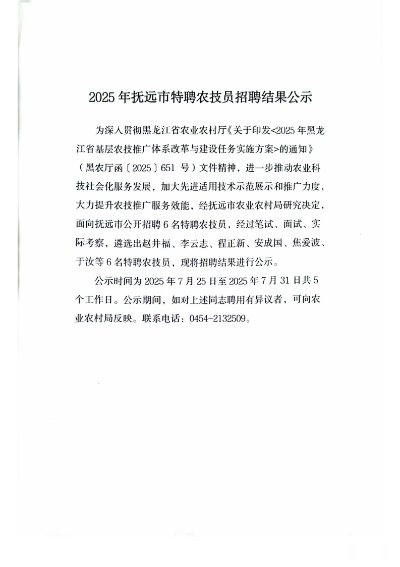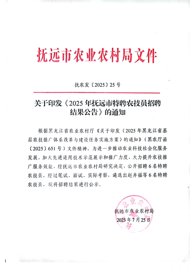 關于印發《2025年撫遠市特聘農技員招聘結果公告》的通知
